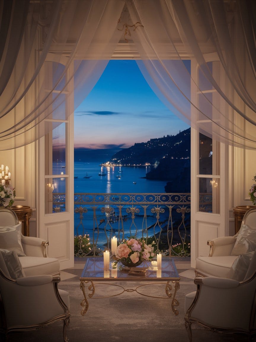 Luxurious seaside villa interior with a view of a coastal Mediterranean town