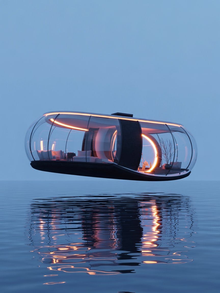 A futuristic floating house with transparent curved glass with smart lighting system