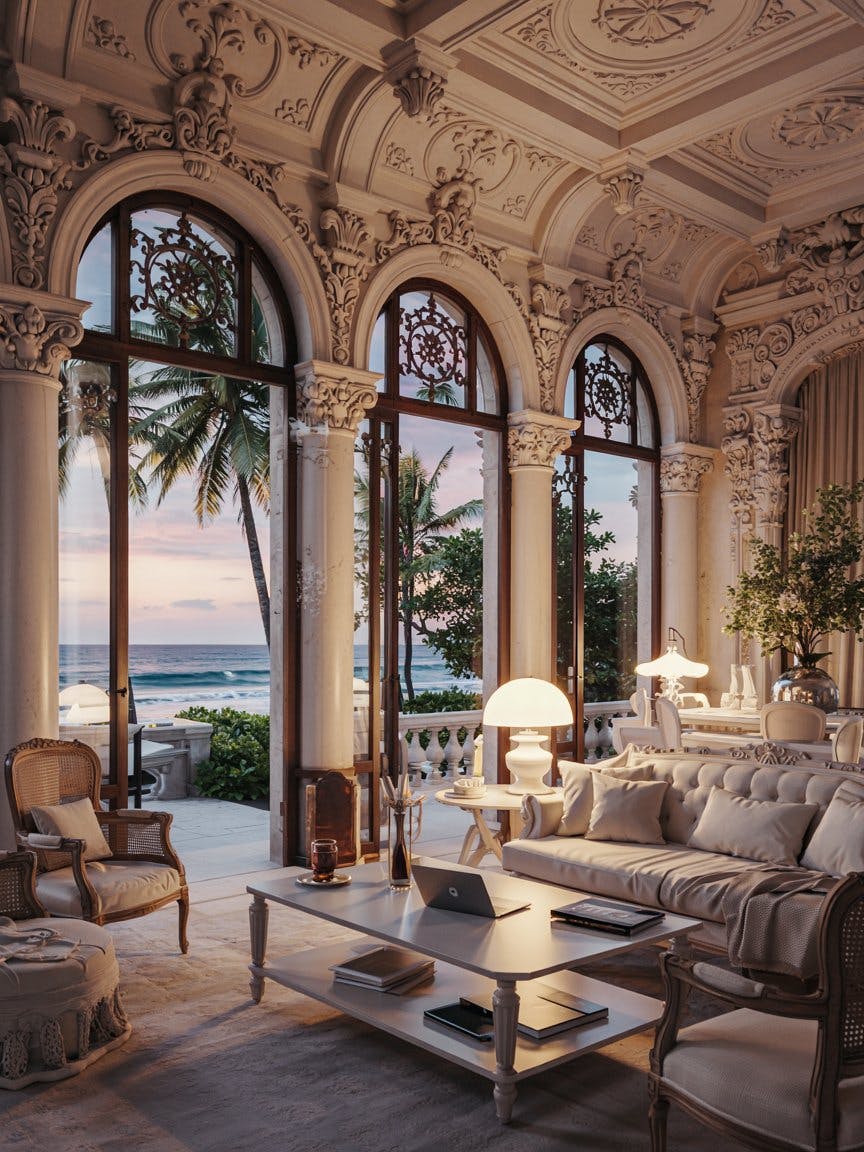 Luxurious open-air palace by the sea with ornate baroque architecture