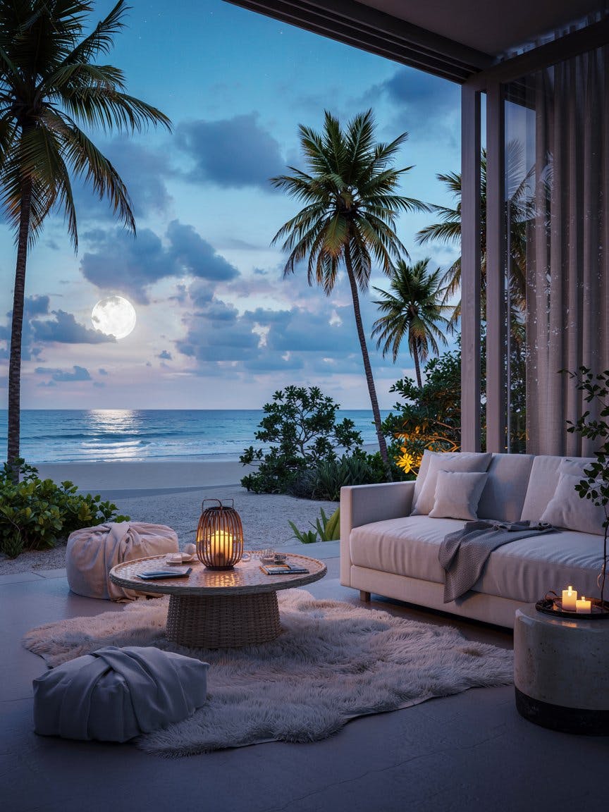 Modern beachfront villa interior with white sofa with soft cushions featuring full moon