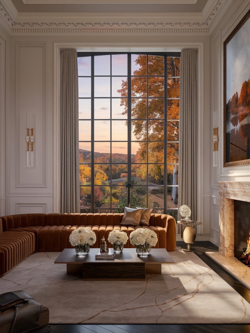 Luxe fall living room framed by floor-to-ceiling panoramic windows