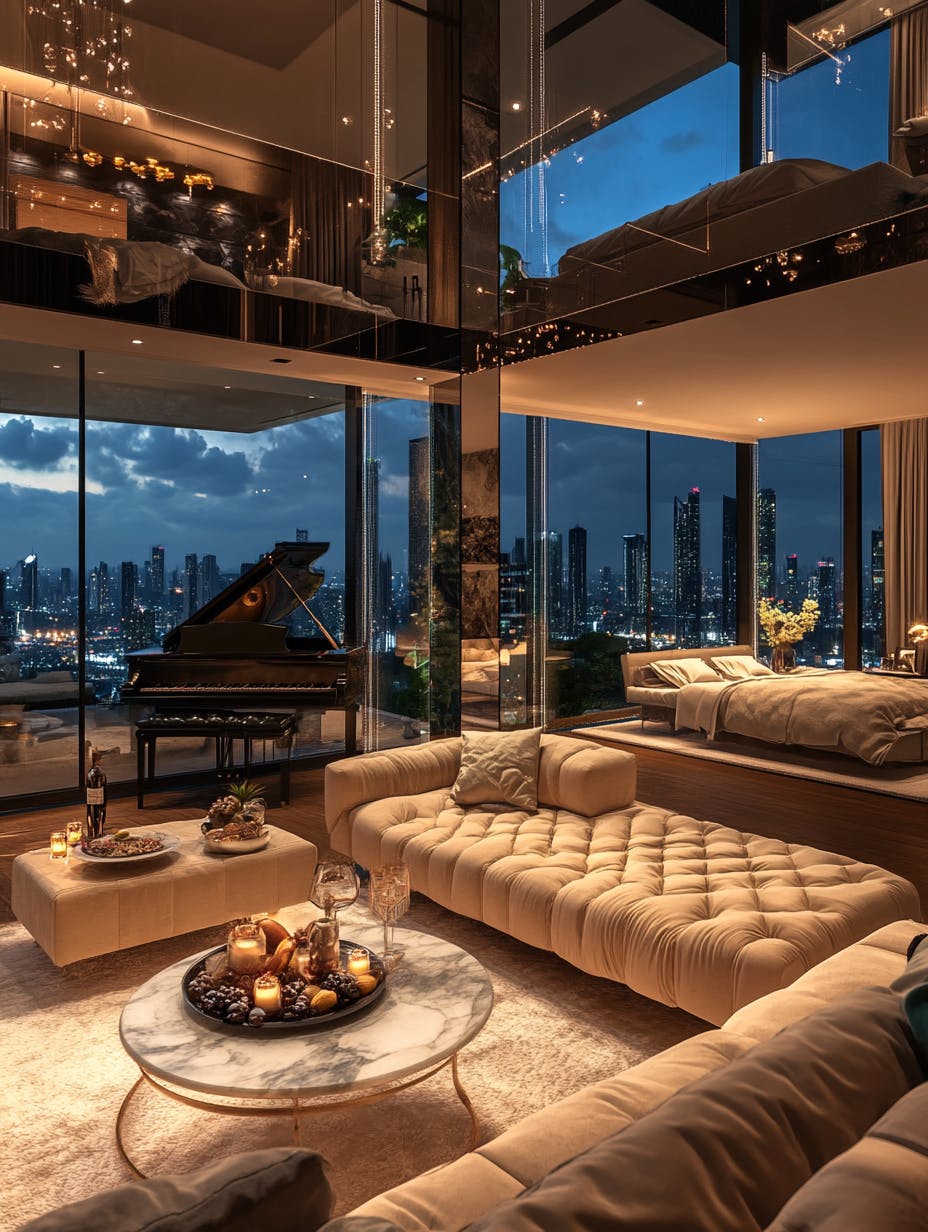 Luxury penthouse with a grand piano near the windows with city skyline view at night
