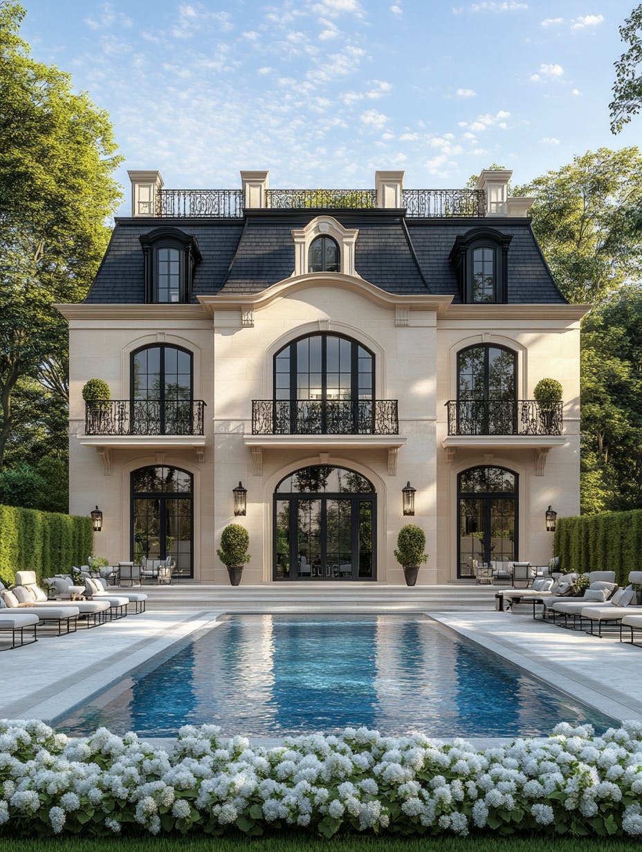 Elegant French-style mansion with a luxurious backyard with a pristine swimming pool