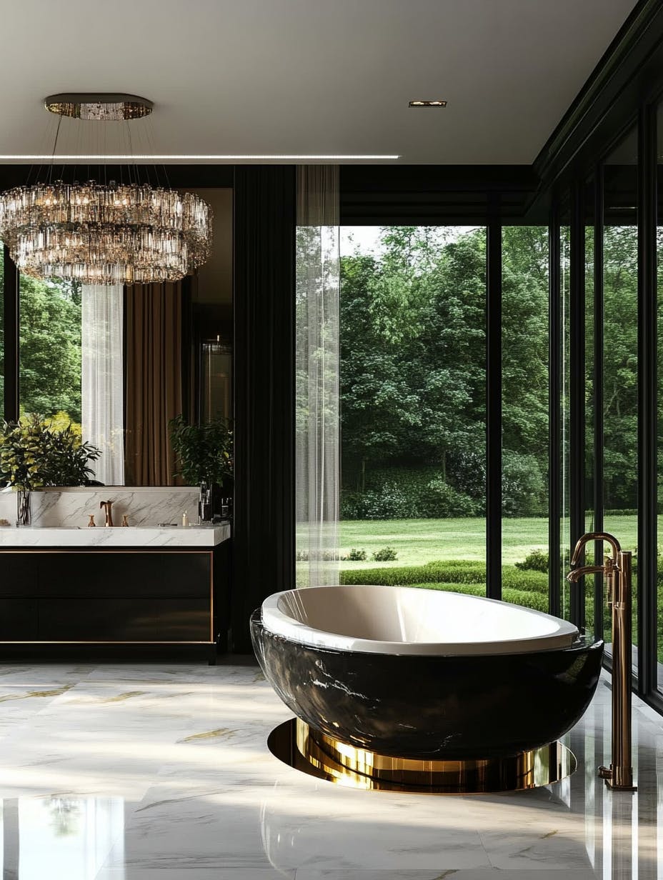 Luxurious bathroom with elegant marble bathtub and lush green garden view