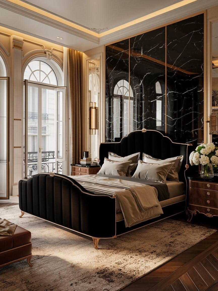 Classic European-style bedroom with black and gold luxury