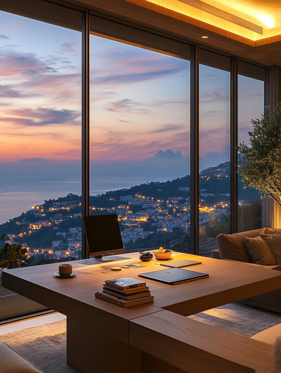 A luxurious modern workspace with a view of a hillside town with twinkling lights