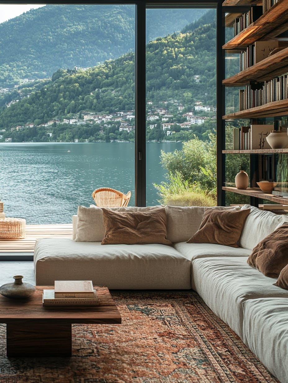A luxurious modern space with panoramic views and warm natural tones