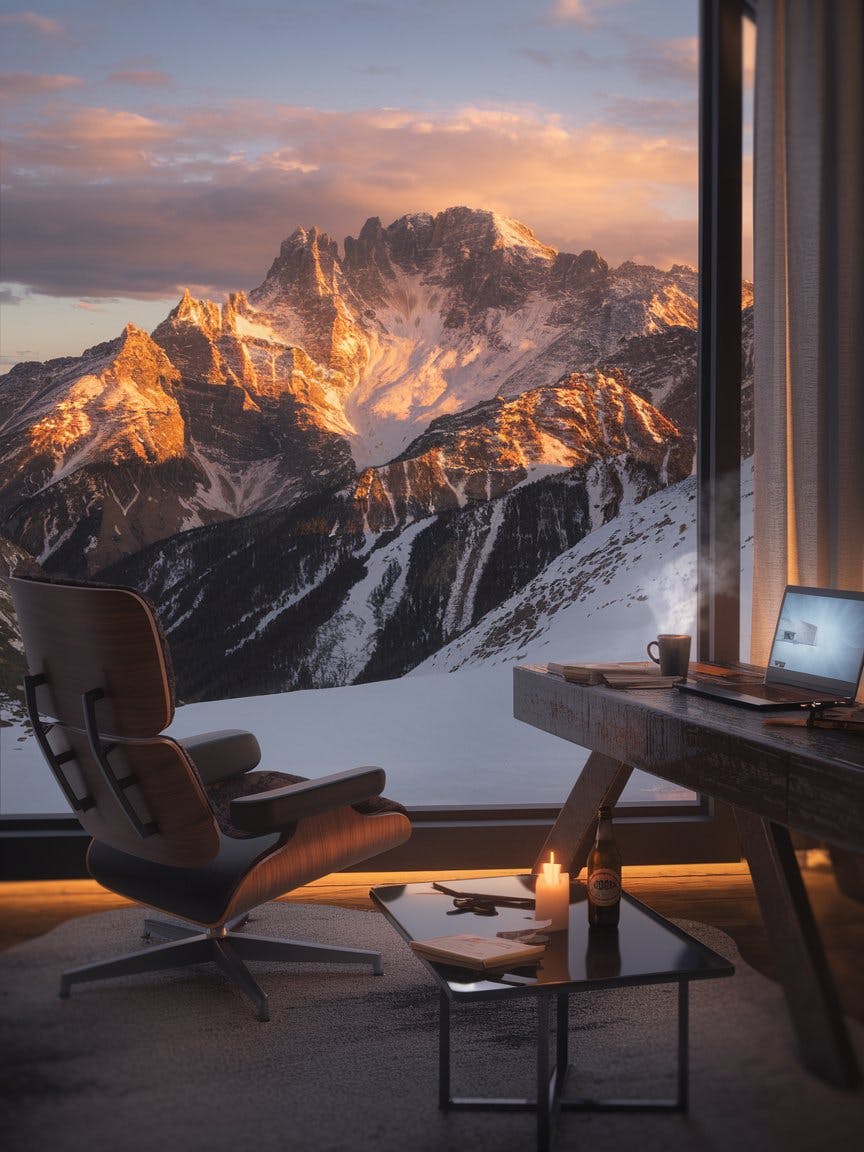 A cozy wooden retreat with a large window framing a golden-lit mountain range