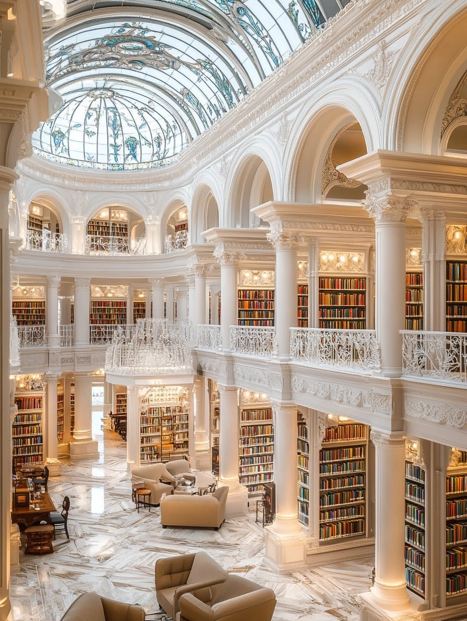 Futuristic library interior with flowing organic architecture and floor-to-ceiling books