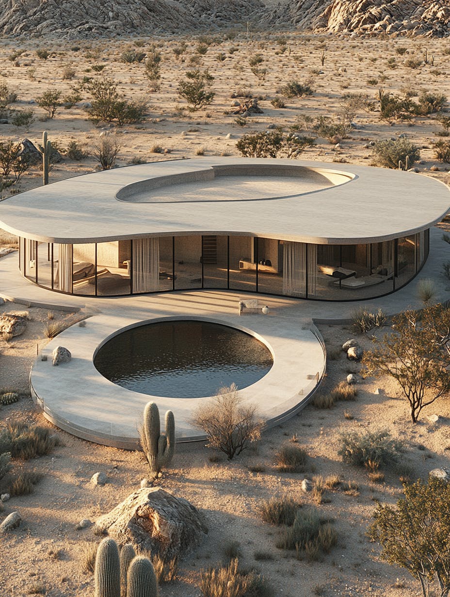 Aerial view of a high-end circular desert hotel with a minimalist ring-shaped architecture