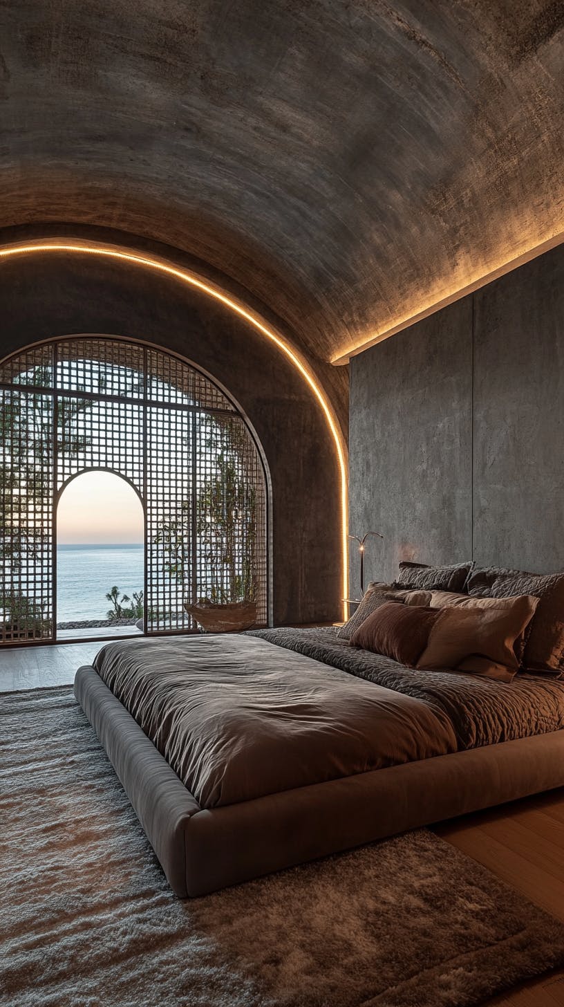 high-end bedroom in futuristic seafront villa with wood lattice arched window
