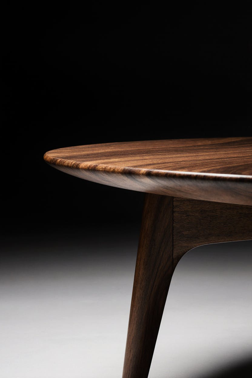 Minimalist close-up of a handcrafted walnut coffee table with black backdrop