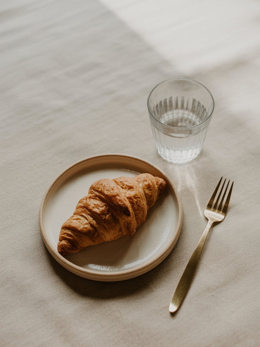 minimal breakfast setting on a beige linen table with croissant on a plate