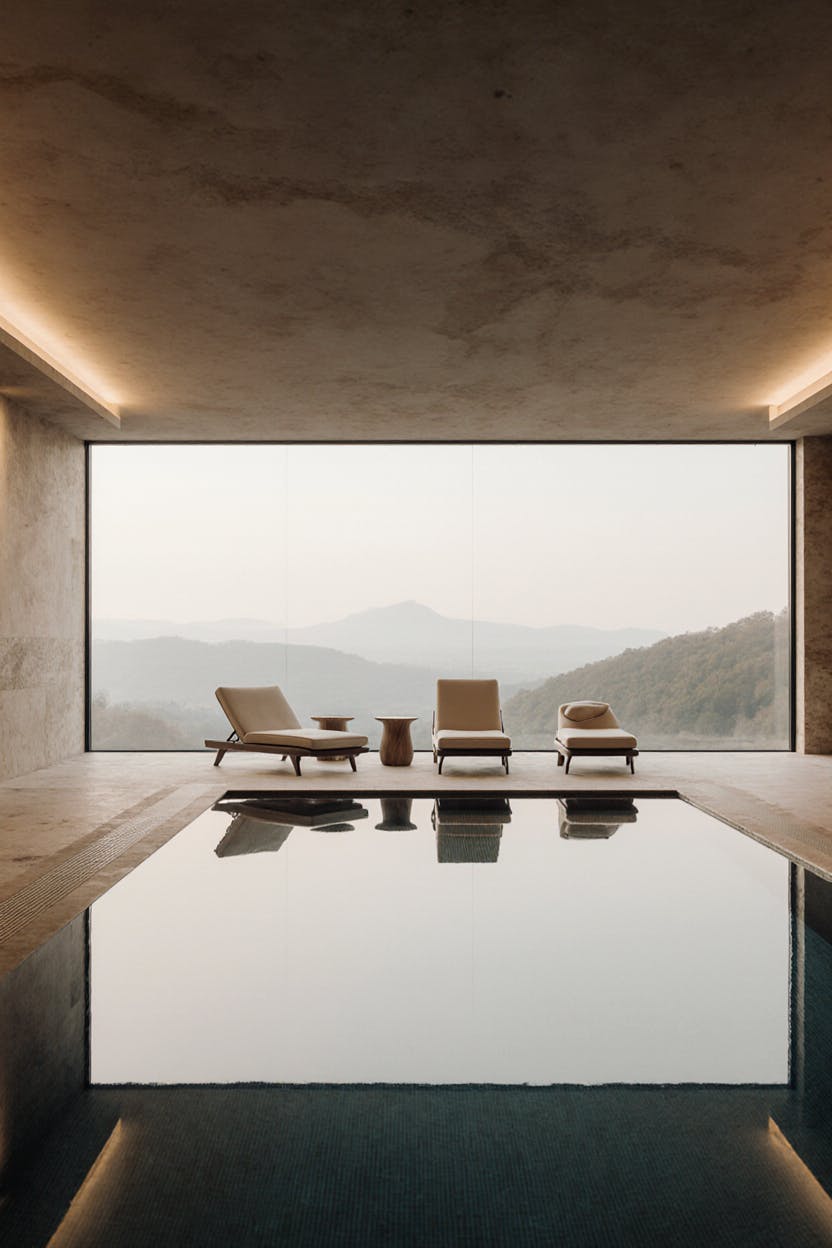 luxury indoor swimming pool with natural stone flooring with earthy beige tones