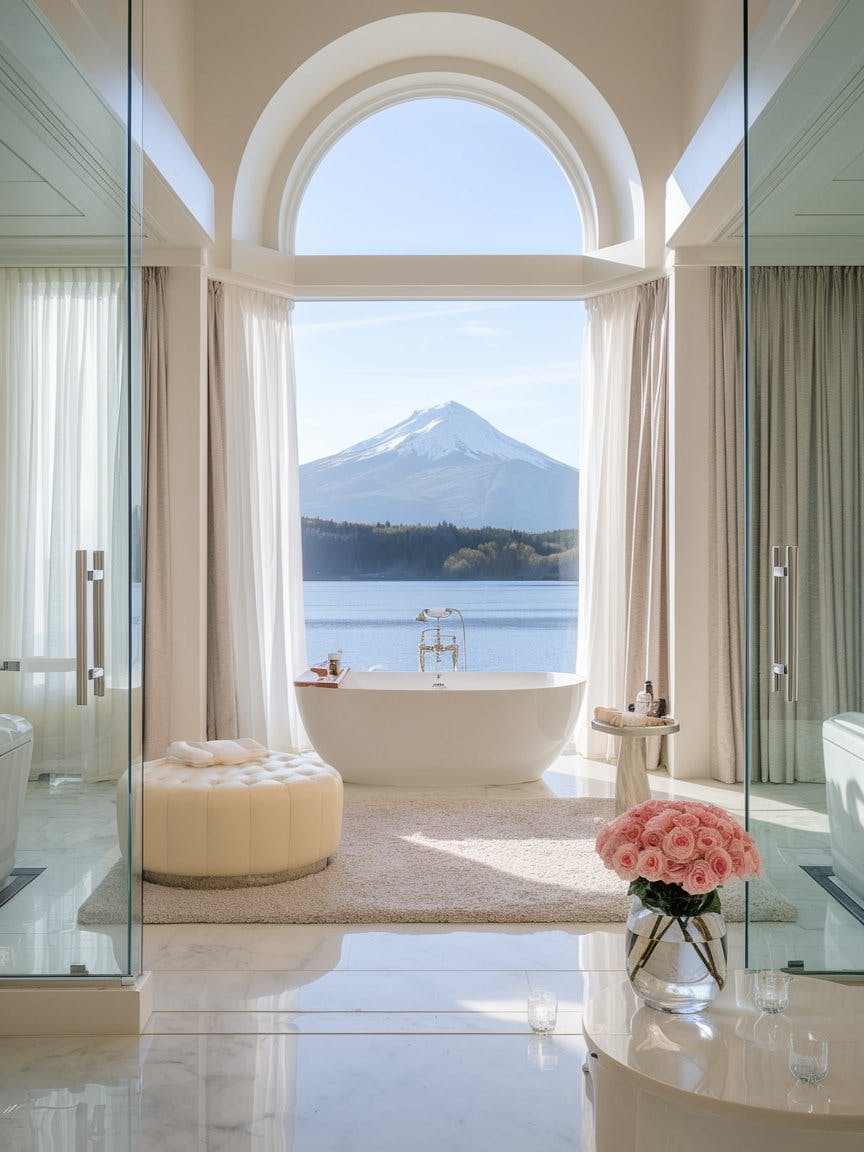 Luxury white interior spa bathroom with a view of snow-capped mountain