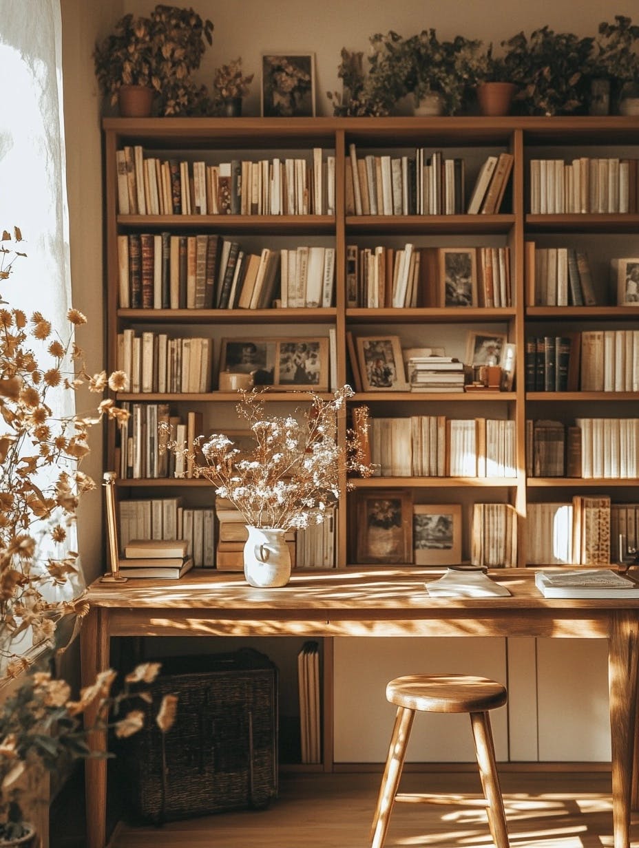 Cozy vintage study room with a dried flowers in a white ceramic vase