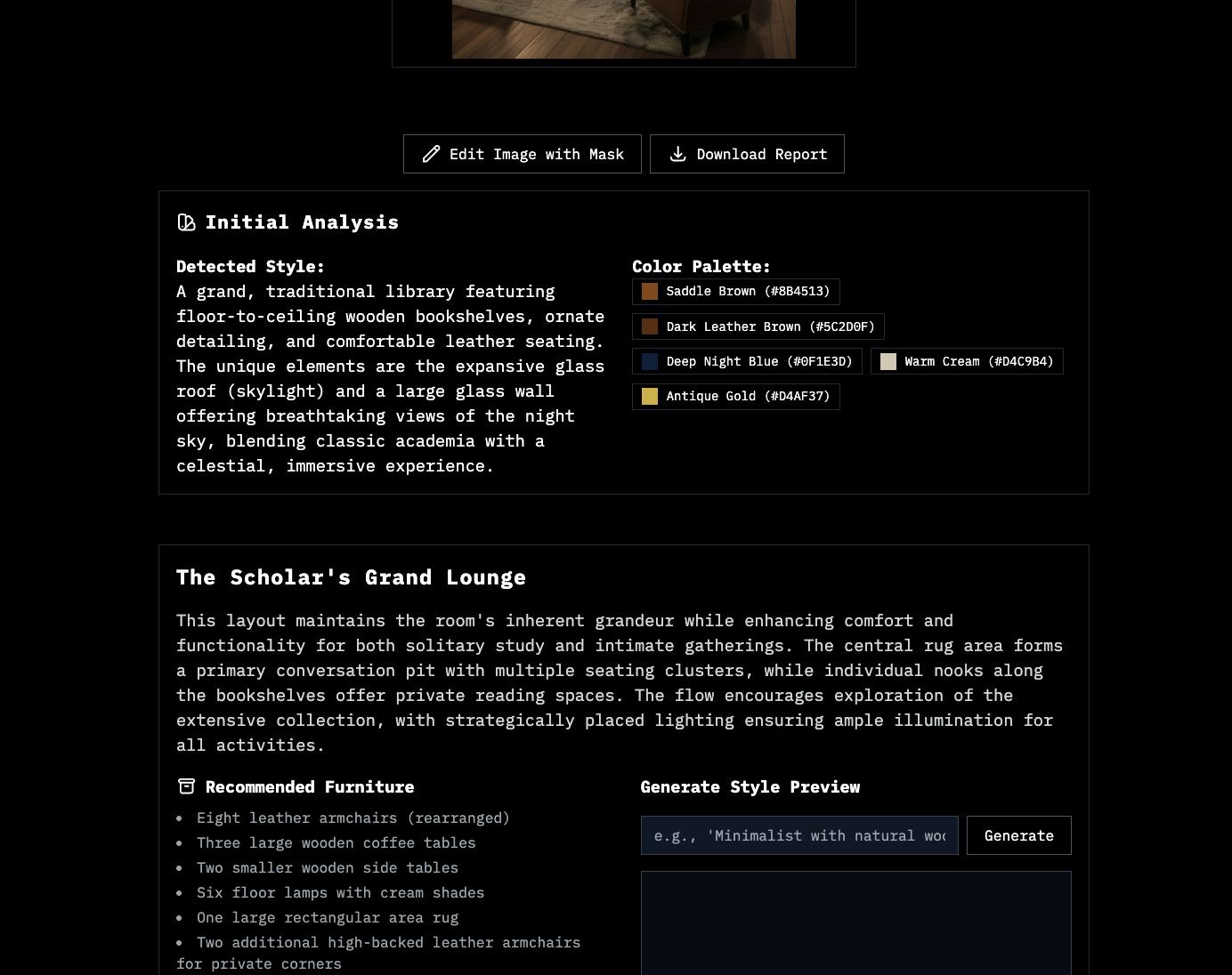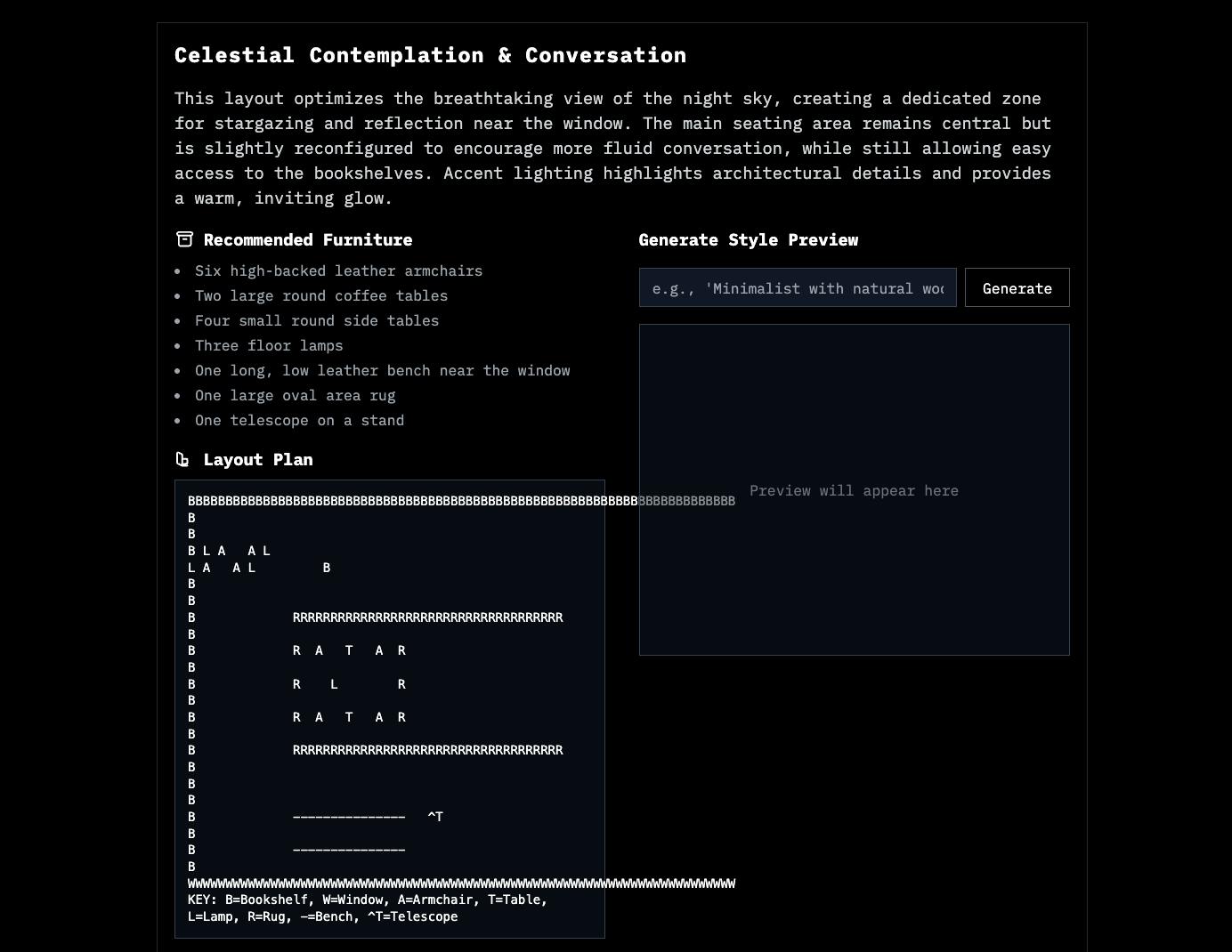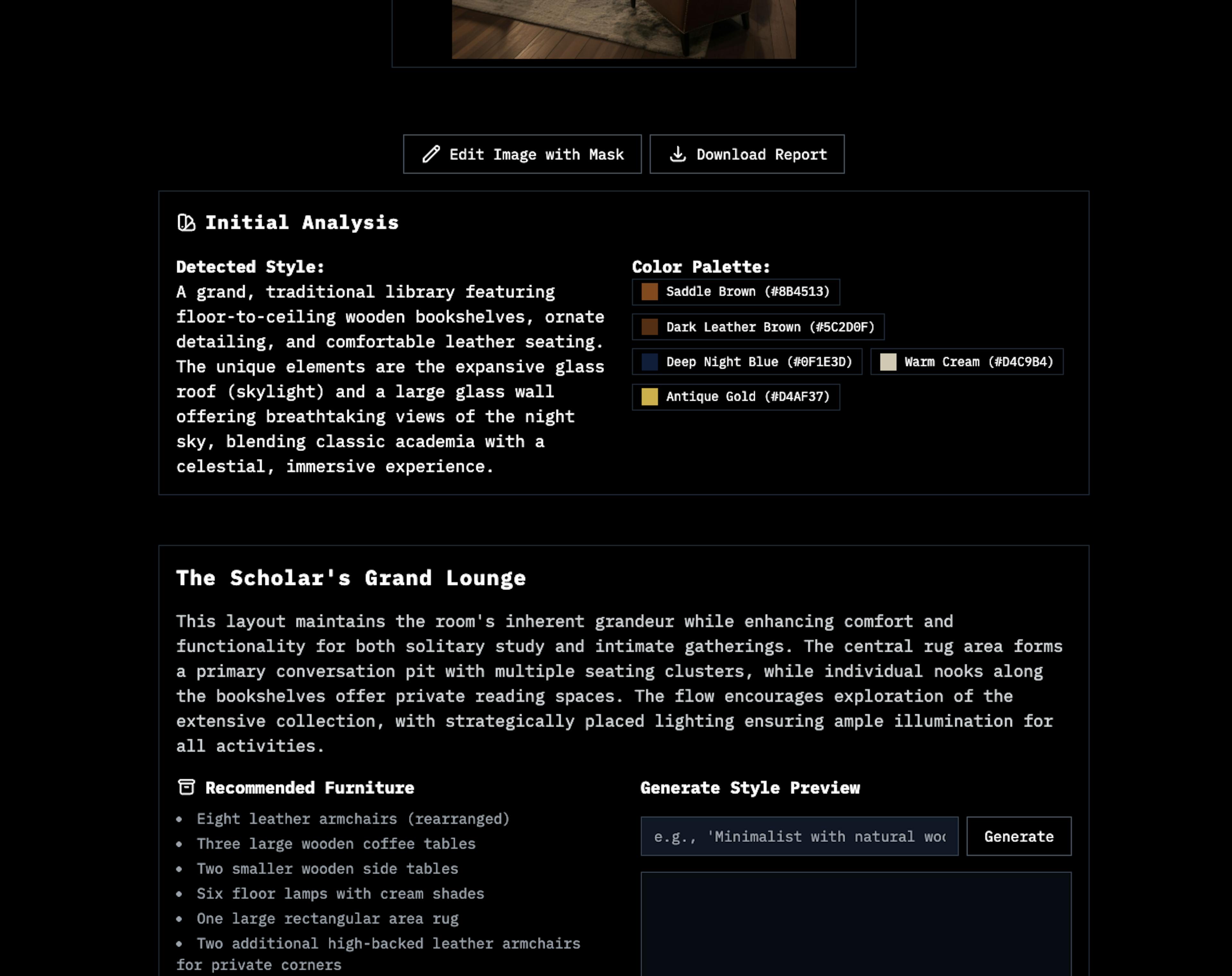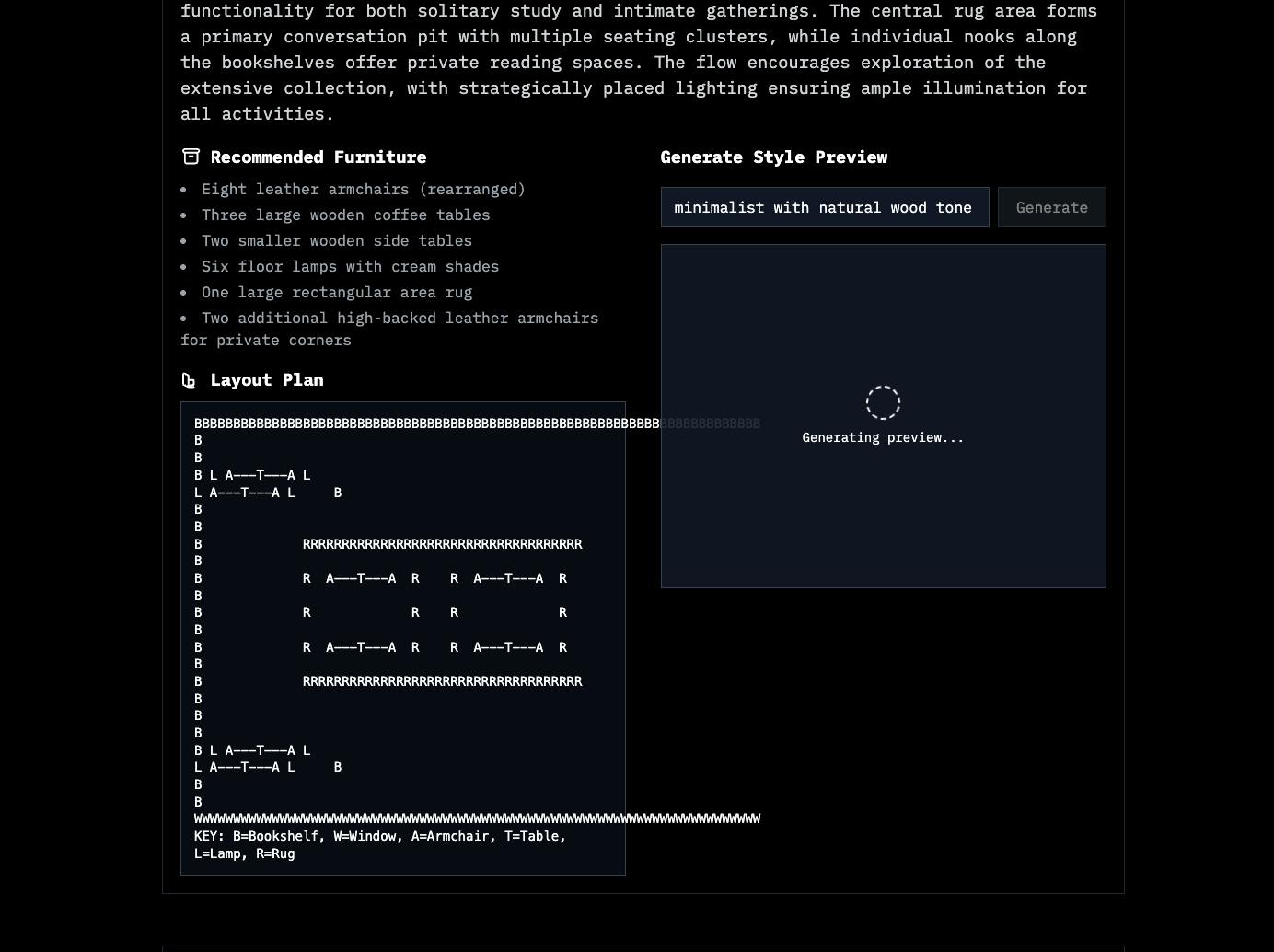 I made an AI-powered interior design assistant that analyzes room photos to generate 2–3 optimized furniture layouts with spatial flow guidance and product recommendations. It also performs style transformations—like Minimal, Natural, or Modern Luxury—through intelligent tone and material adaptation. Built with Google Gemini Flash and the Nano-Banana model for high-speed vision analysis and realistic image editing, the system delivers design insights, style previews, and exportable layout reports.