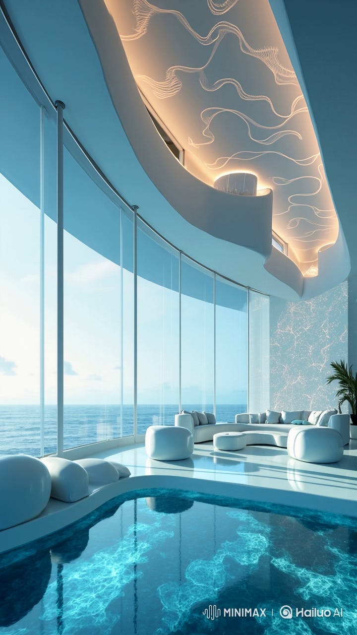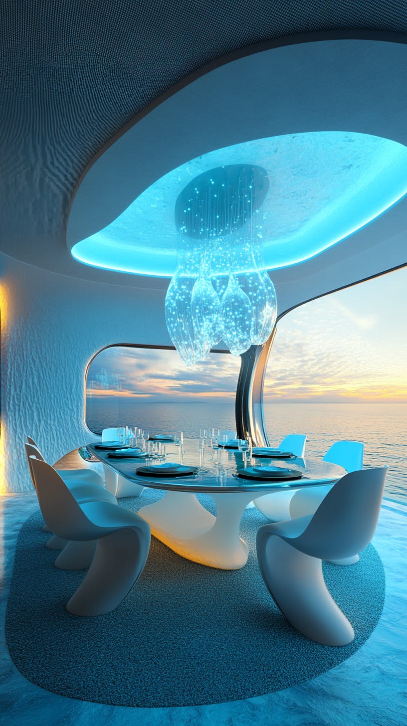 Aurelia Habitat is a speculative architectural project inspired by the collective behavior of jellyfish (Aurelia aurita) and the regenerative principles of marine ecosystems. It envisions a floating modular housing system where each capsule-like unit autonomously generates energy through seawater electrolysis, connects via magnetic levitation bridges, and reconfigures itself based on spatial or environmental needs. The design integrates organically curved forms with responsive technologies—such as bio-sensor glass, dynamic lighting systems, and ocean-temperature-reactive elements—to mirror the rhythmic flow of the ocean. Key interior spaces include a panoramic lounge with an integrated pool, a dining room illuminated by fiber-optic chandeliers, a wave-simulated bathroom, and a circadian-lighting bedroom. Rather than a luxury home, Aurelia Habitat imagines an adaptive, self-sufficient living organism shaped by the logic of nature.