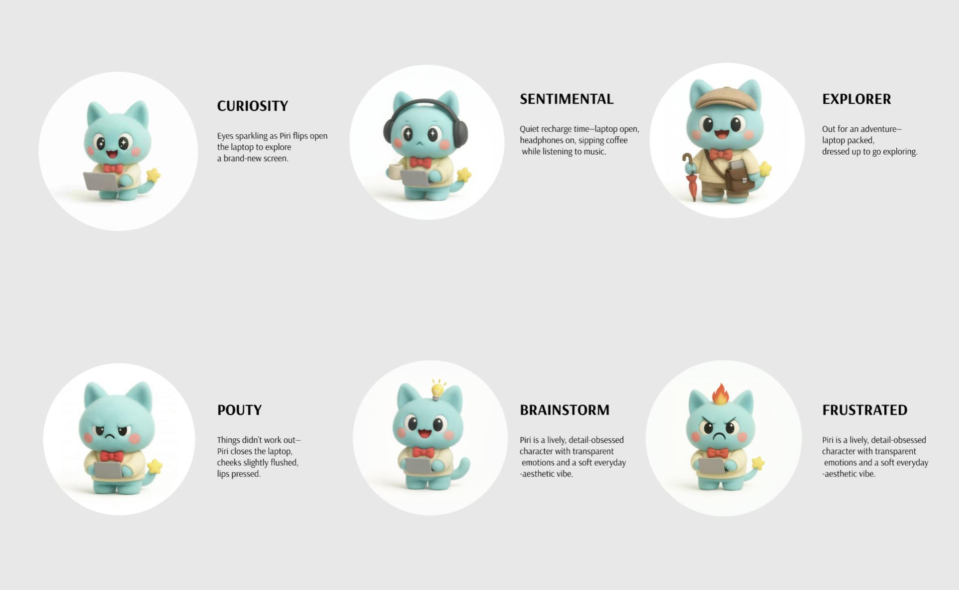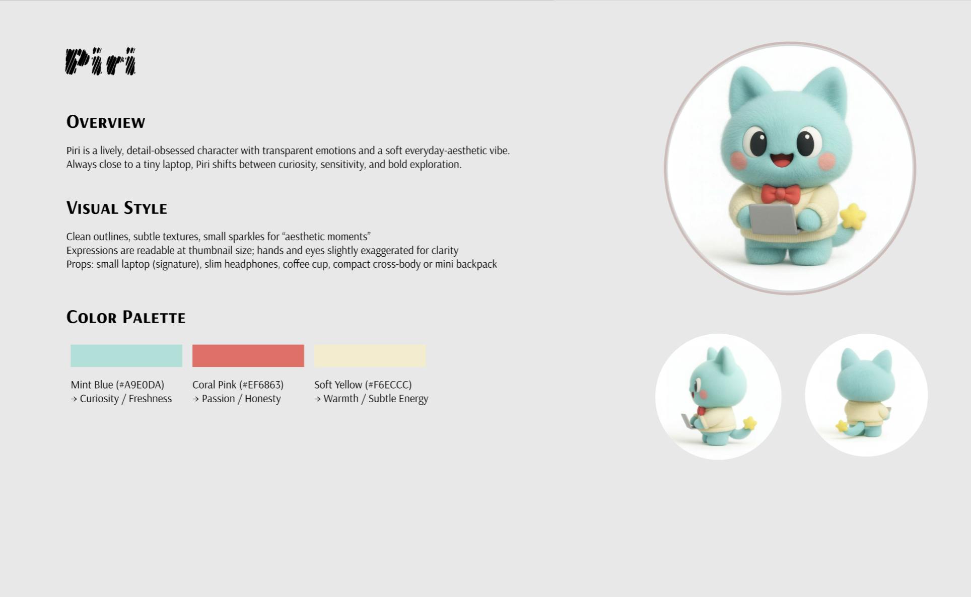 I designed Piri, a lively and detail-obsessed mascot character with a soft everyday-aesthetic vibe. From defining the overview and emotional range to crafting the visual style, props, and color palette, I directed the full concept. The project also includes multiple emotional expressions (curiosity, sentimental, explorer, pouty, brainstorm, frustrated), ensuring adaptability across digital and branding contexts.