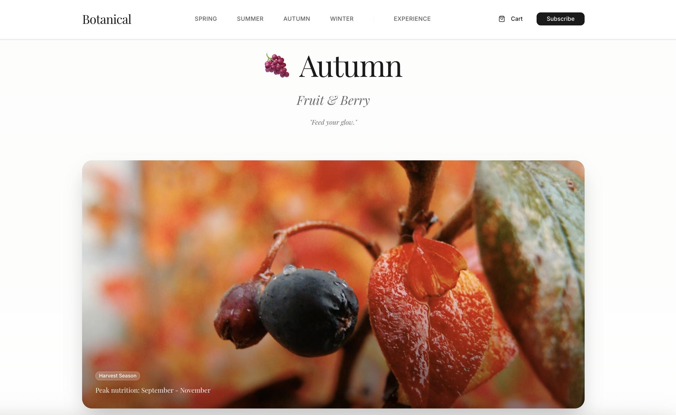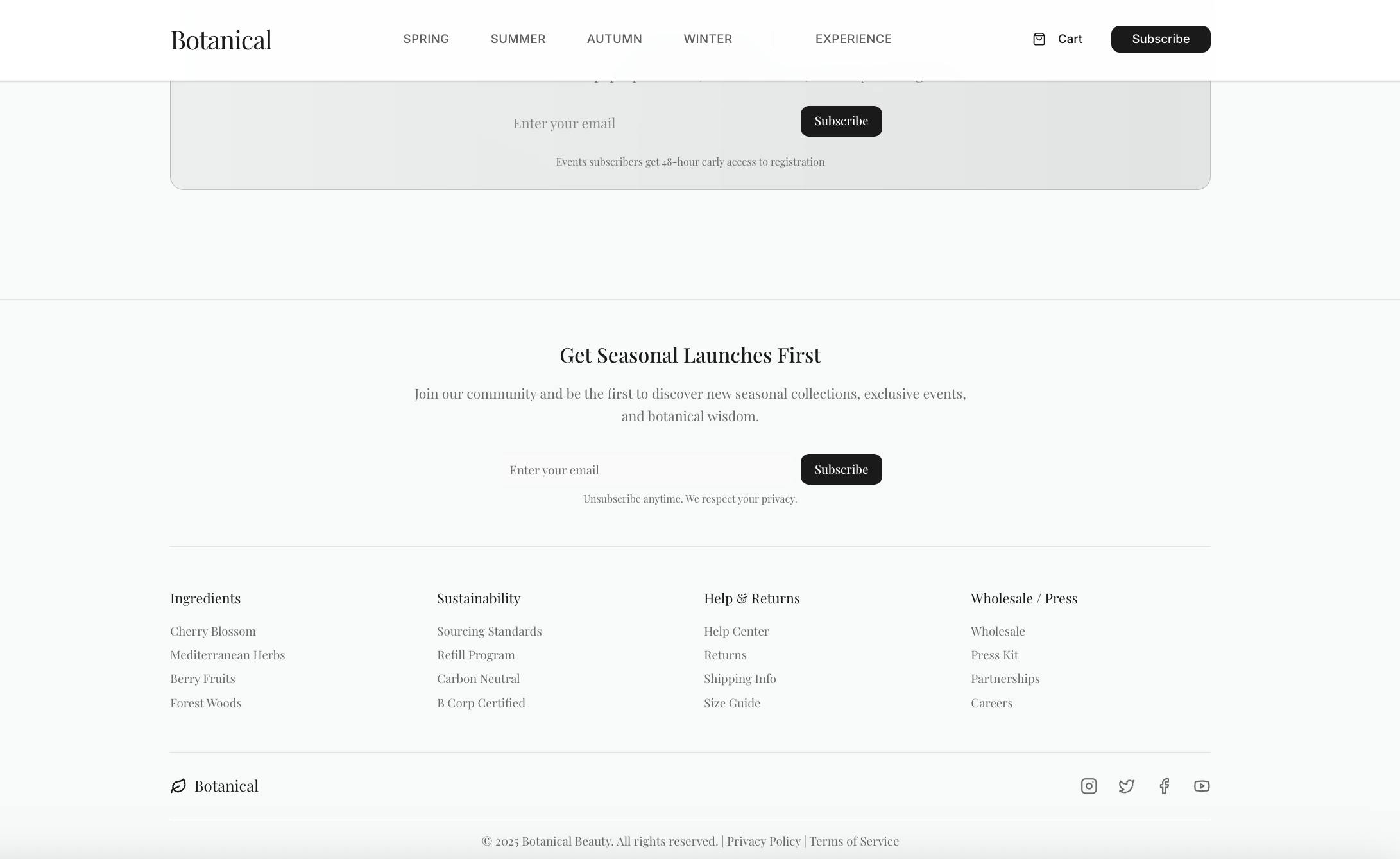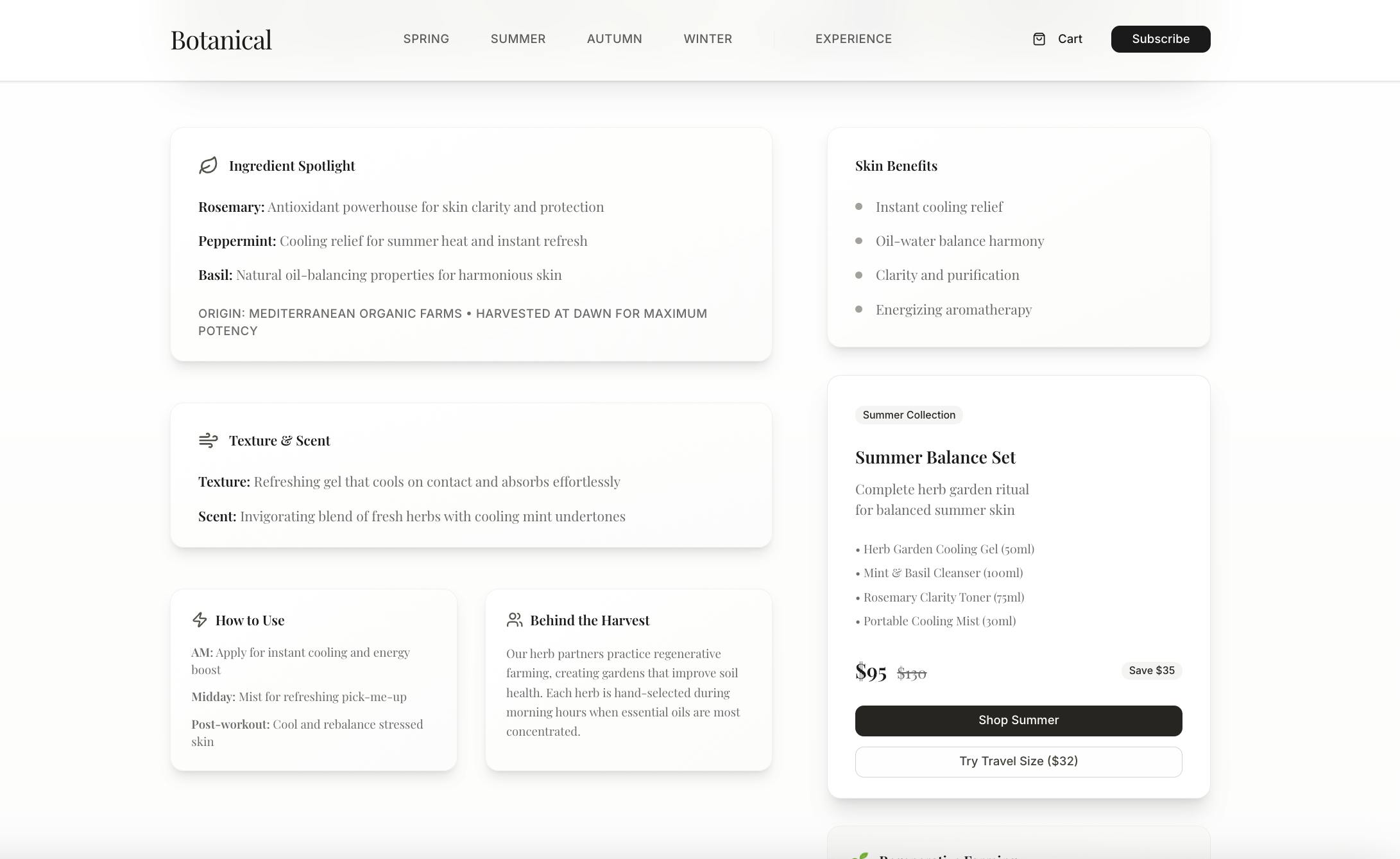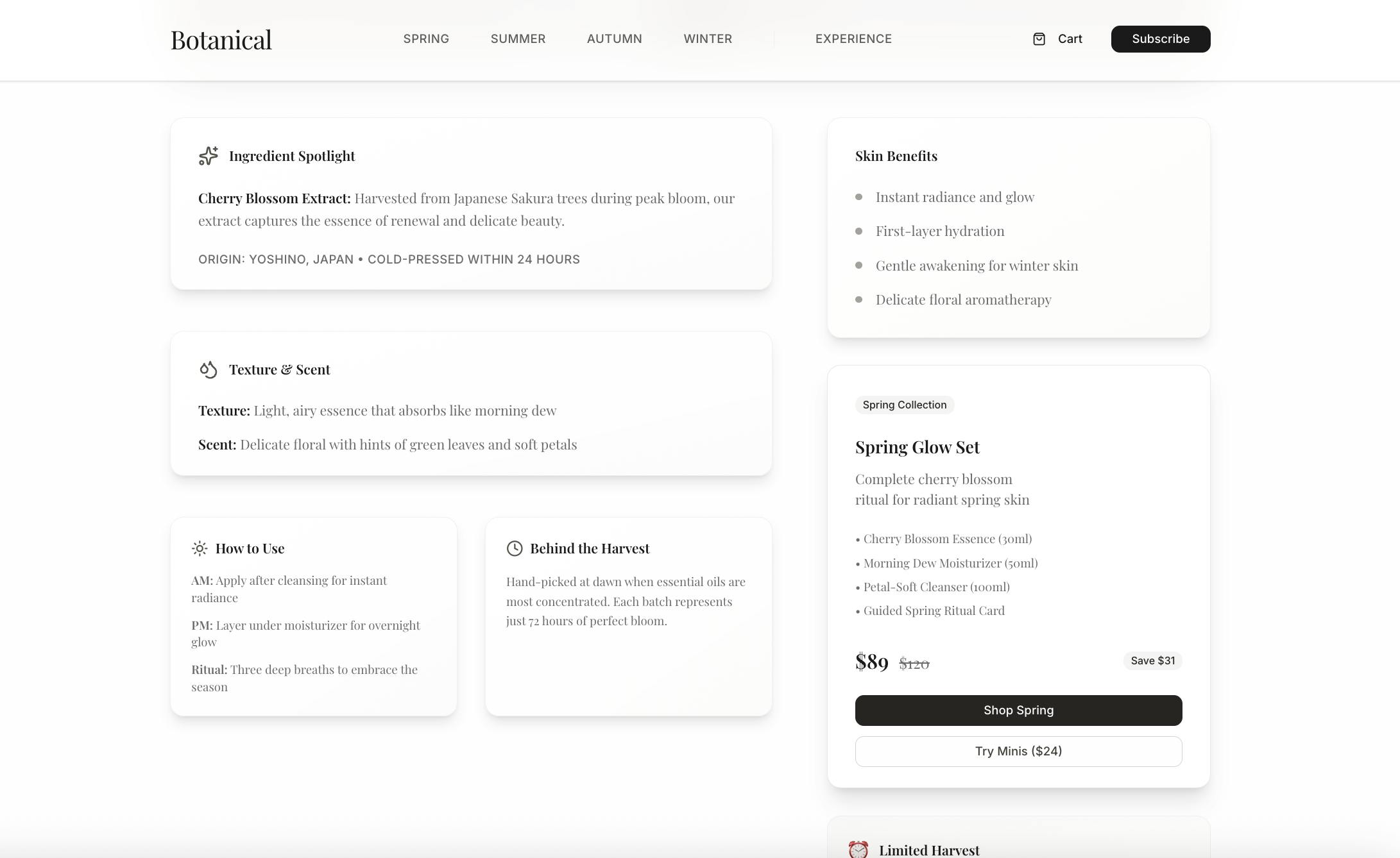 I planned an immersive website experience that reflects nature’s seasonal cycle, from blossoms to woods. Each section highlights ingredient origins, sensory details, and skincare rituals tailored to spring, summer, autumn, and winter. The design blends storytelling with commerce, creating a seamless journey from inspiration to purchase.